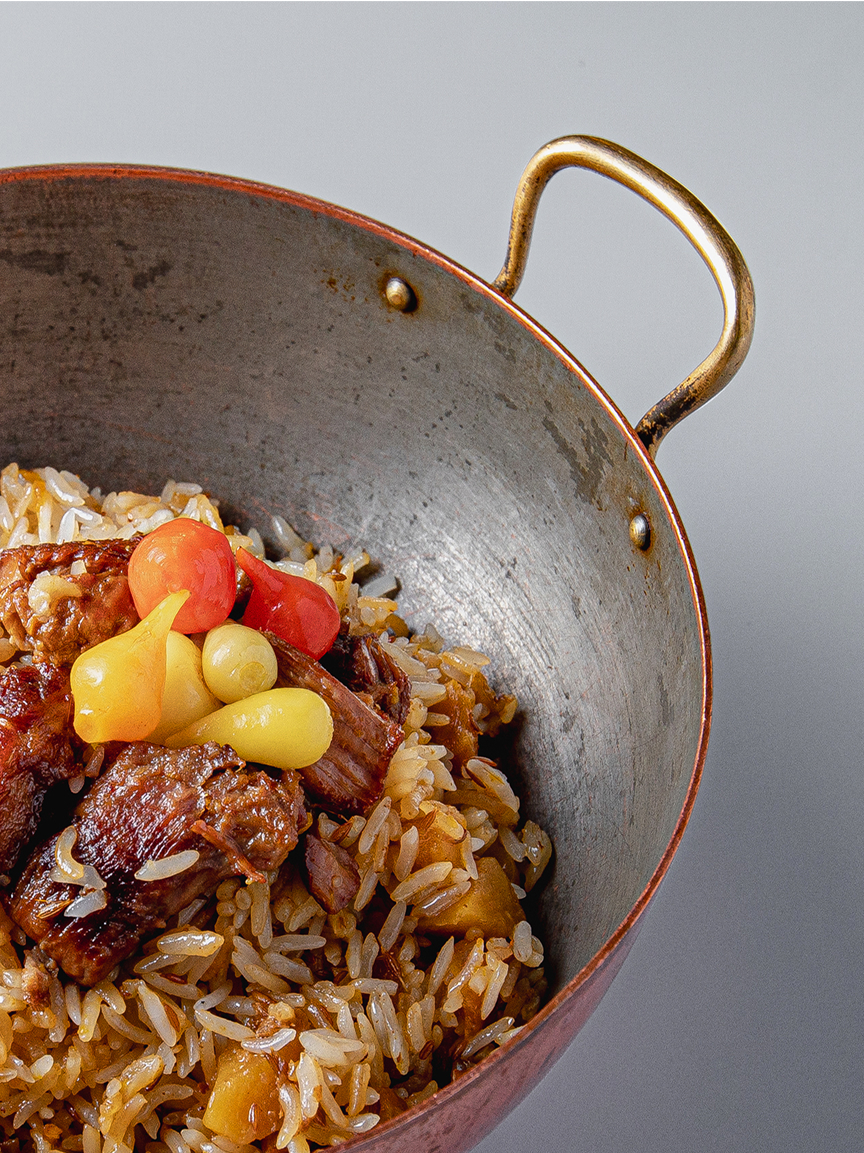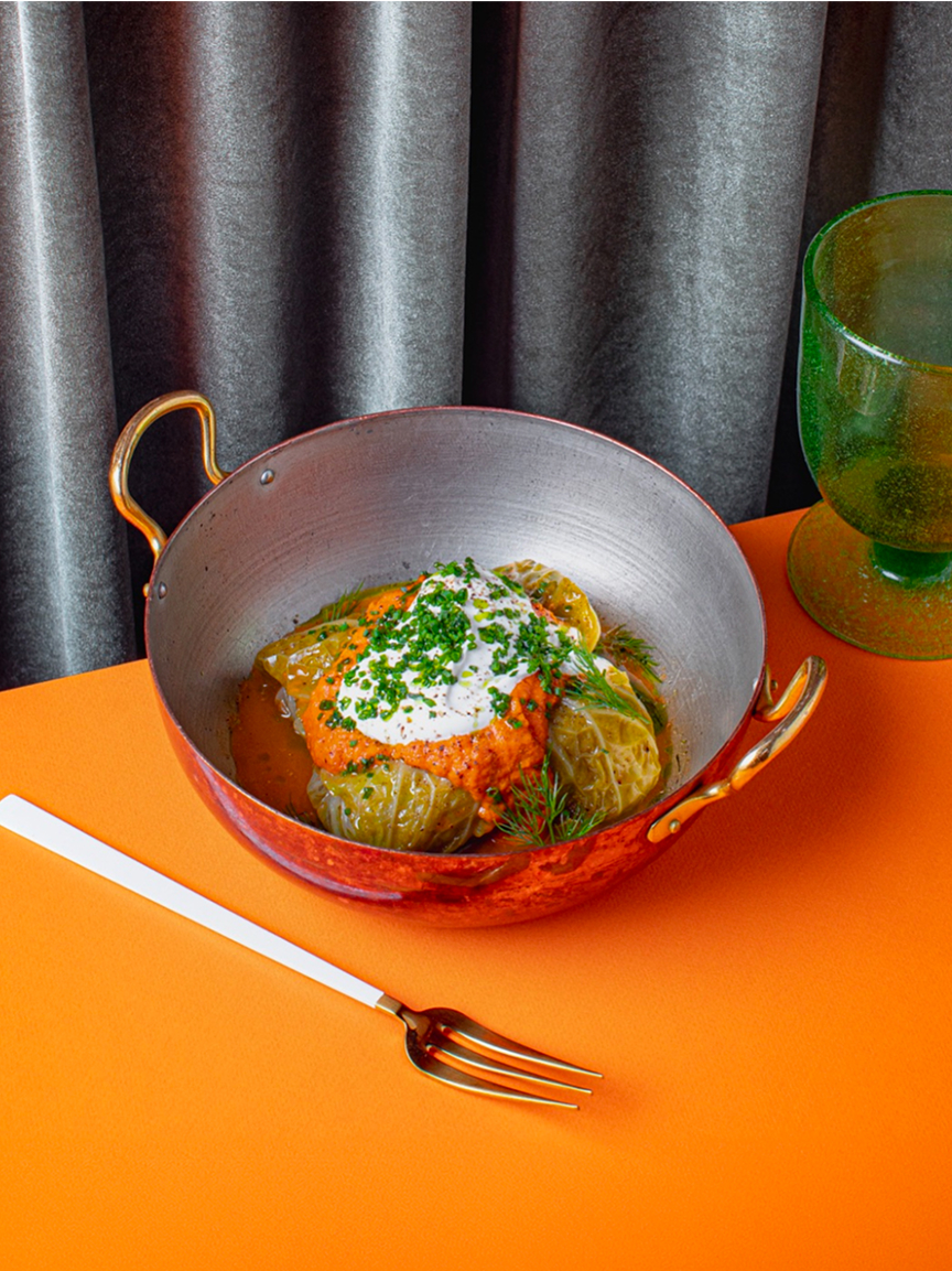 Глубокая медная сковорода с двумя латунными ручками в ресторане Vasilchuki