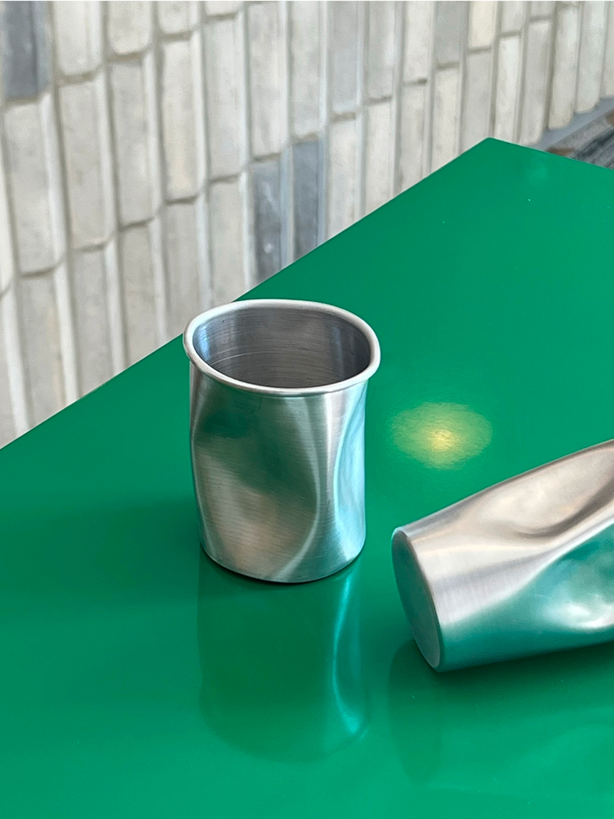 Мятые анодированные алюминиевые стаканы, изготовленные по заказу пиццерии Maestrello